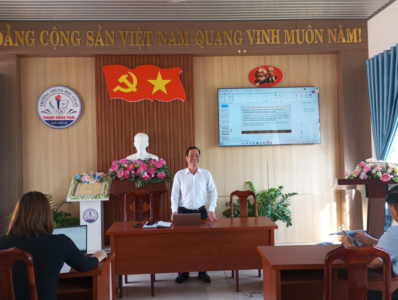 Thời gian qua, Chi bộ trường THCS Phạm Hồng Thái đã chủ động triển khai Nghị quyết số 57-NQ/TW ngày 22/12/2024 của Bộ Chính trị về đột phá phát triển khoa học – công nghệ, đổi mới sáng tạo và chuyển đổi số quốc gia; Kế hoạch số 06-KH/ĐU ngày 19/8/2025 của Đảng ủy xã Ea Ô về thực hiện Nghị quyết 57-NQ/TW; đồng thời tích cực hưởng ứng Phong trào “Bình dân học vụ số” do Đảng ủy xã phát động. Các nội dung được quán triệt sâu rộng đến đội ngũ đảng viên, giáo viên của nhà trường.