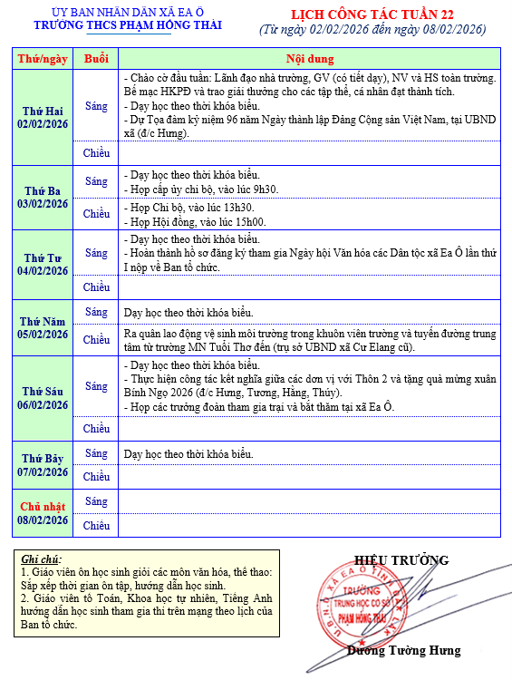Lịch công tác tuần (từ ngày 02/02/2026 – 08/02/2026)