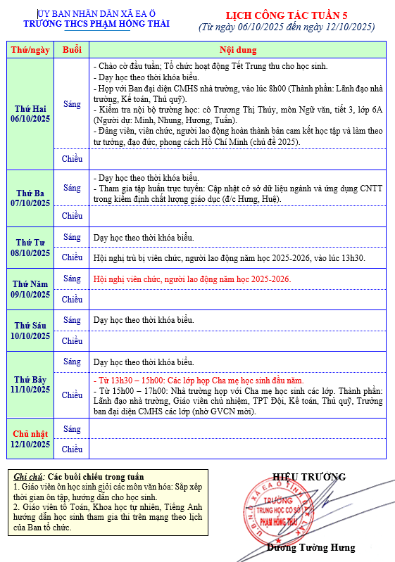 • Lịch công tác tuần (từ ngày 06/10/2025 – 12/10/2025)