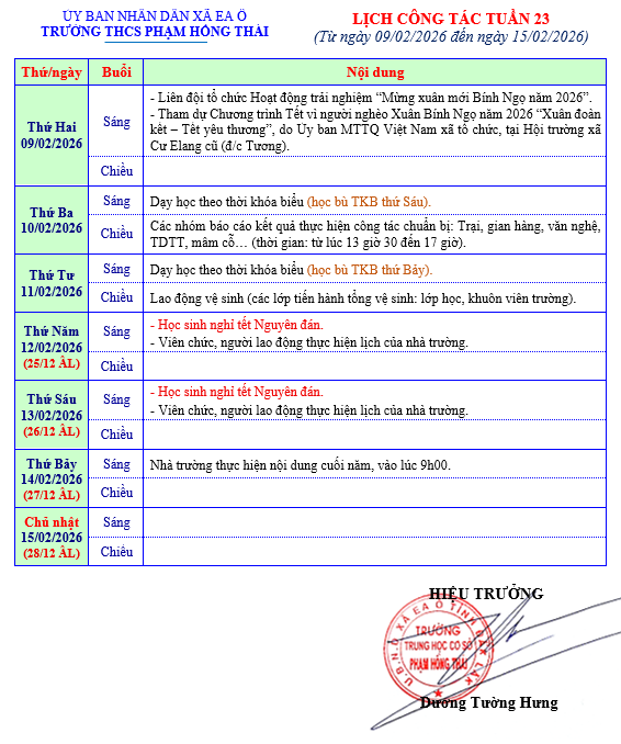 Lịch công tác tuần (từ ngày 09/02/2026 – 15/02/2026)
