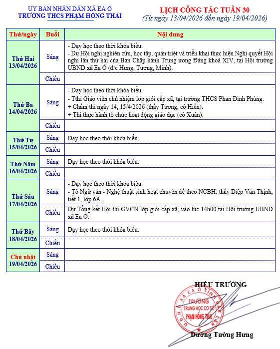 • Lịch công tác tuần (từ ngày 30/3/2026 – 05/4/2026)