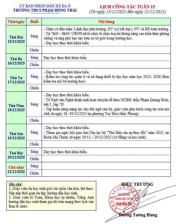 • Lịch công tác tuần (từ ngày 15/12/2025 – 21/12/2025)