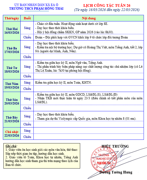 Lịch công tác tuần (từ ngày 16/3/2026 – 22/3/2026)