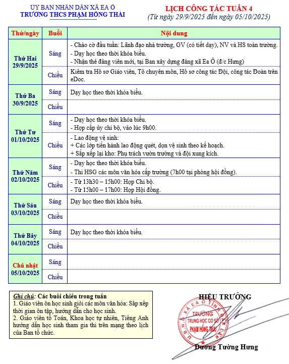 3. Lịch công tác tuần (từ ngày 29/9/2025 – 05/10/2025)